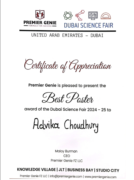 At the Emirates Environmental Group’s 25th Inter-School Environment Public Speaking Competition, I was honored to be named the Day 4 Winner among 25+ schools. My team and I went on to secure the title of Overall Champions, standing out among 120+ schools and over 700 students.