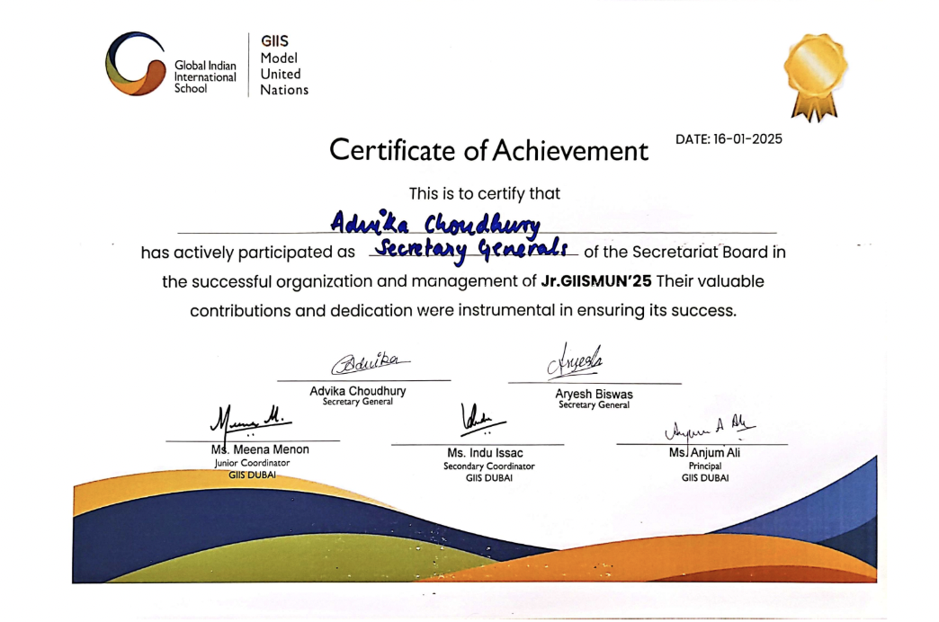 My MUN journey began in 6th grade, evolving from a curious delegate to leadership roles. In 2025, as Secretary-General, I led the conference, mentored delegates, and shaped debates that fostered diplomacy, reflecting my growth in leadership, communication, and global awareness.