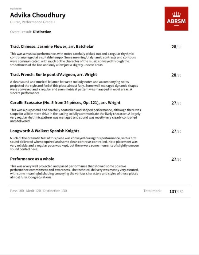 I began learning guitar during COVID as a way to explore music more deeply, and it soon grew into a passion. In 2025, I was awarded a Distinction in ABRSM Grade 1 Guitar Performance, scoring 137/150. This journey has strengthened my discipline, focus, and creativity, while giving me a new way to express myself through musi