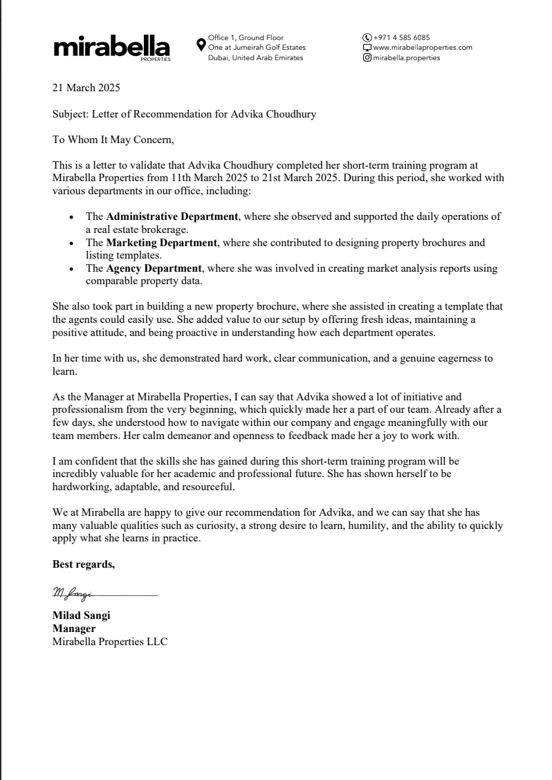 In March 2025, I completed a short-term training program at Mirabella Properties, where I worked across the Administrative, Marketing, and Agency departments. I contributed to property brochures, market analysis, and listing templates, while gaining insights into real estate operations. The experience strengthened my adaptability, teamwork, and communication skills, and I was commended for my initiative and eagerness to learn