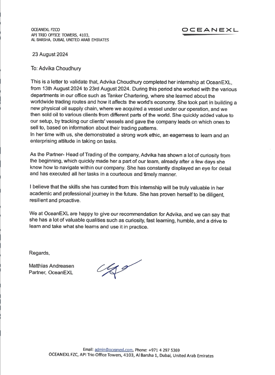 In August 2024, I interned at OceanEXL, where I worked on tanker chartering and global oil trading routes. I contributed to building a new supply chain, tracking client vessels, and analyzing trading patterns. The experience sharpened my analytical skills and was praised for my curiosity, adaptability, and strong work ethic.